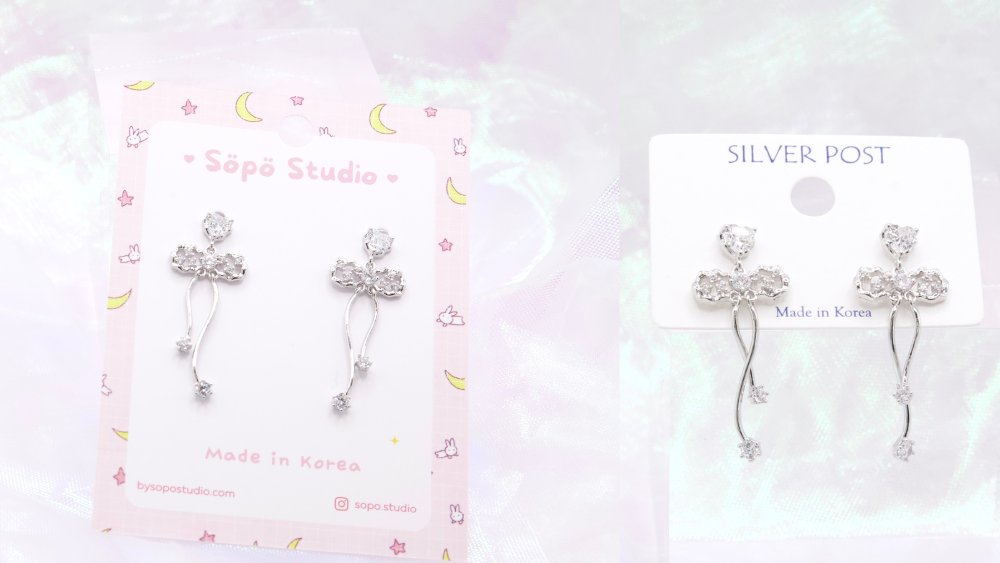 Ribbon Cute Flower Crystal Mis-matched Korean Earrings - Silver posts