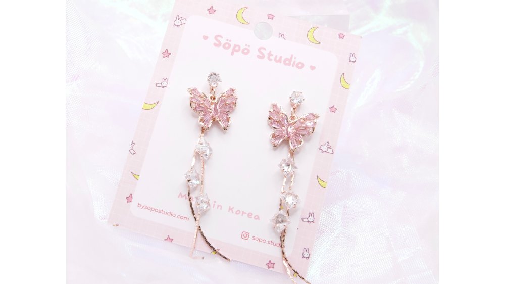 Korean Pink Pastel Crystal Butterfly Dangle Earrings