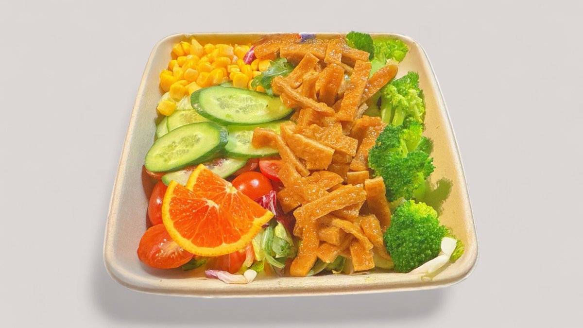 Sushitofua, salaattia, parsakaalia, kirsikkatomaatteja, kurkkua, maissinjyviä, keitetty kananmuna, hedelmiä.