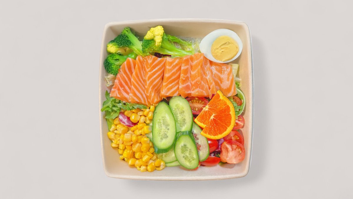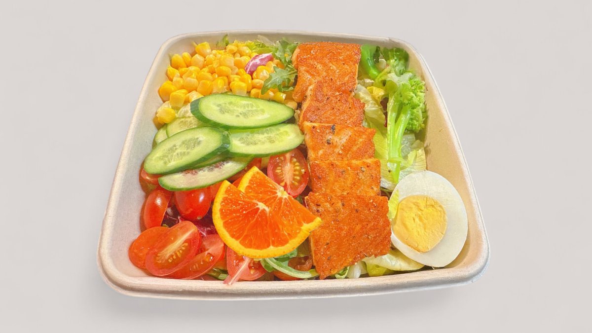 Lohi, salaatti, parsakaali, kirsikkatomaatit, kurkku, maissinjyvät, keitetyt kananmunat, hedelmät.