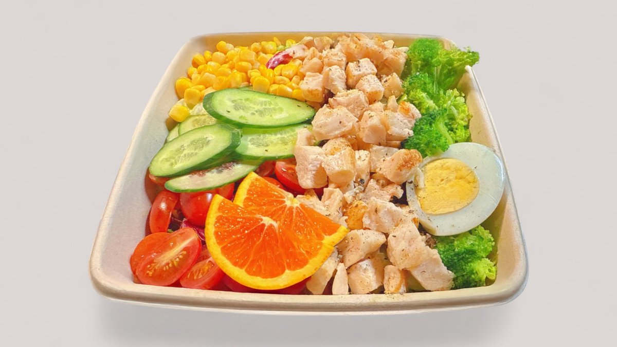 Kananrinta, salaatti, parsakaali, kirsikkatomaatit, kurkku, maissinjyvät, keitetty kananmuna, hedelmät.