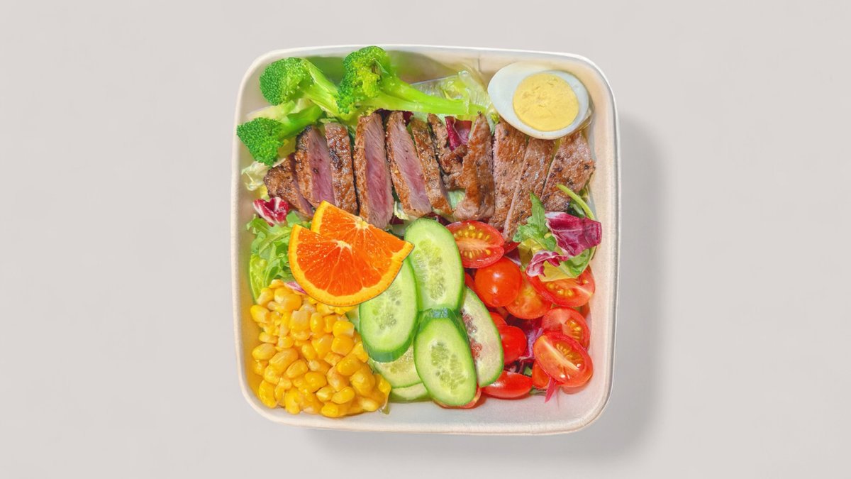 Pihvi, salaatti, parsakaali, kirsikkatomaatit, kurkku, maissinjyvät, keitetty kananmuna, hedelmä.