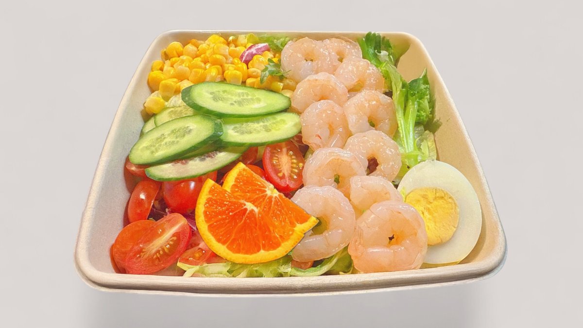 Katkarapuja, salaatinlehtiä, parsakaalia, kirsikkatomaatteja, kurkkua, maissinjyviä, keitettyjä munia ja hedelmiä.