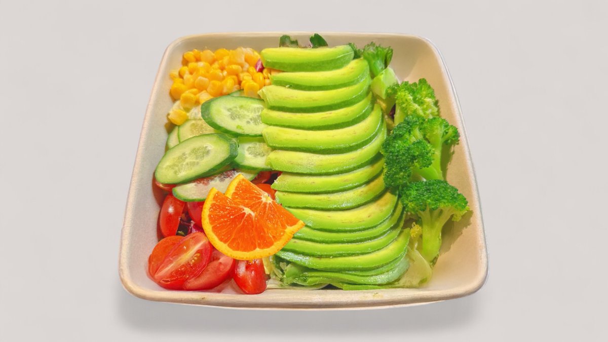 Avokadoa, salaattia, parsakaalia, kirsikkatomaatteja, kurkkua, maissinjyviä, hedelmiä.