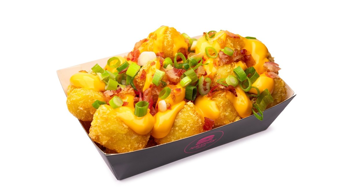 Tater tots -perunoita, pekonimurua, juustokastiketta, kevätsipulia Tater tots potatoes, bacon crumbs, cheese sauce, scallions