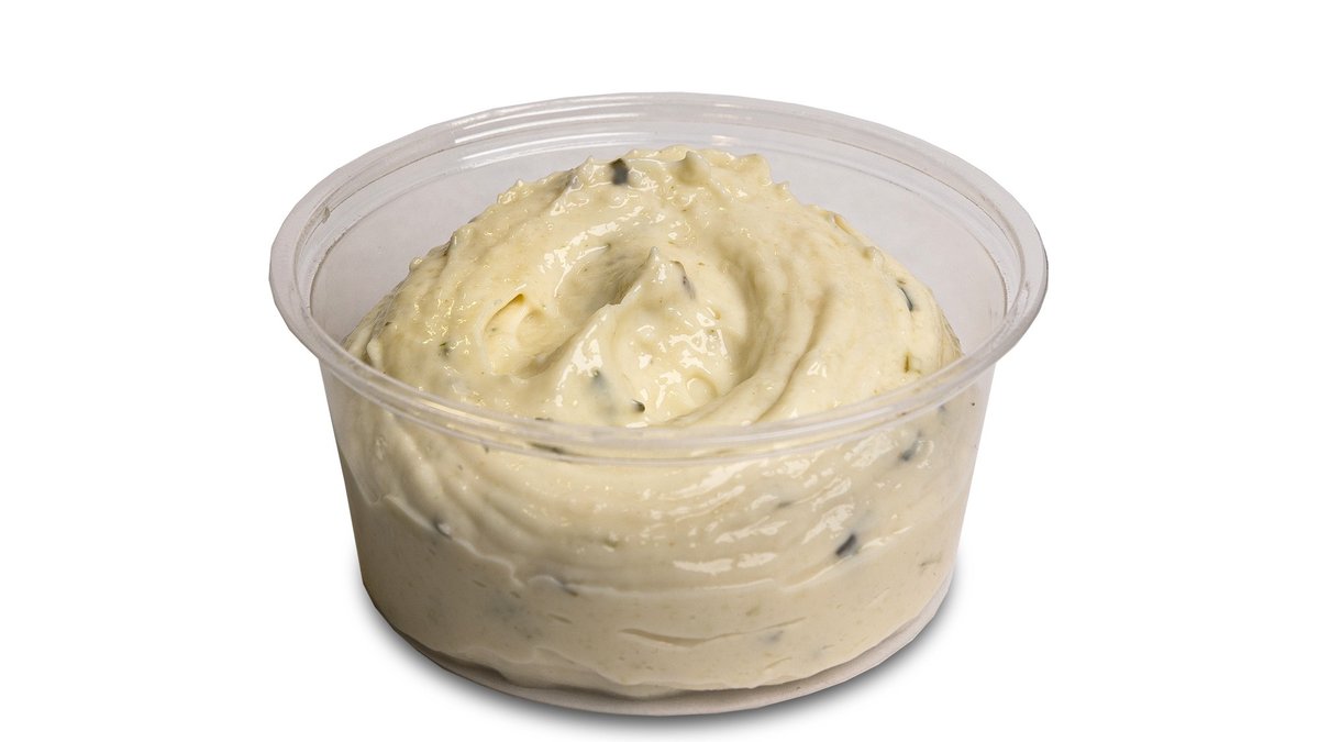 Parmesaanilla ja rosmariinilla maustettu valkosipulimajoneesi. Garlic mayonnaise flavoured with parmesan cheese and rosemary (G)