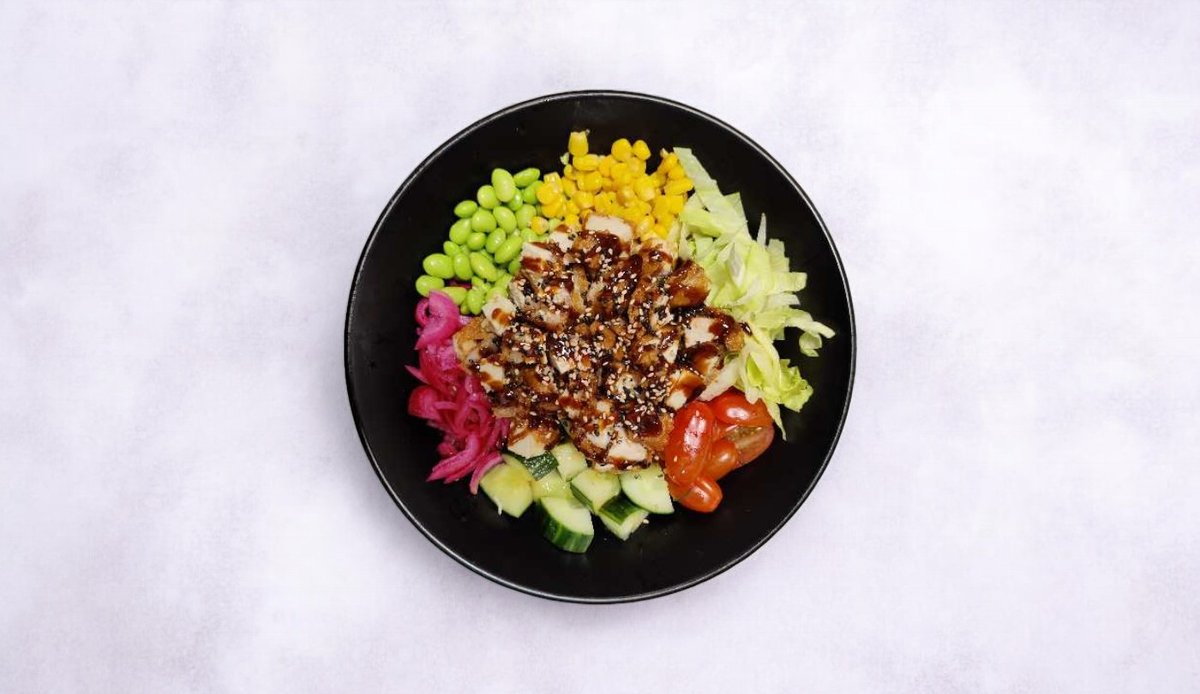 Sushi riisiä, friteerattua kanaa, kurkkua, maissia, edamameja, salaattia, kirsikkatomaattia, marinoitua punasipulia, teriyaki-kastiketta ja seesamia