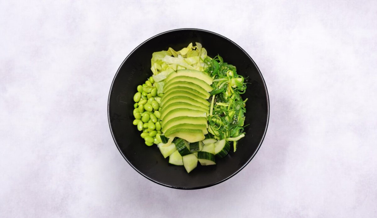Sushiriisiä, avokadoa, edamameja, kurkkua, tuoretta salaattia, merileväsalaattia ja poke bowl-kastiketta