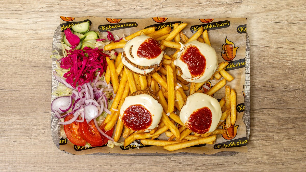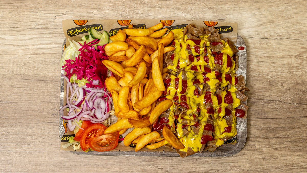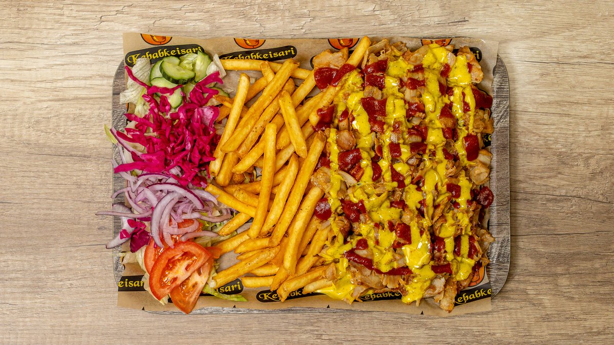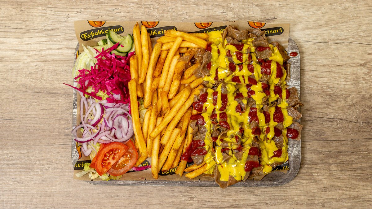 Riisi, lohkoperunat, kebab, makkara, paistettu kanamuna, kurkkusalaatti, jäävuorisalaatti, tomaatti, sipuli