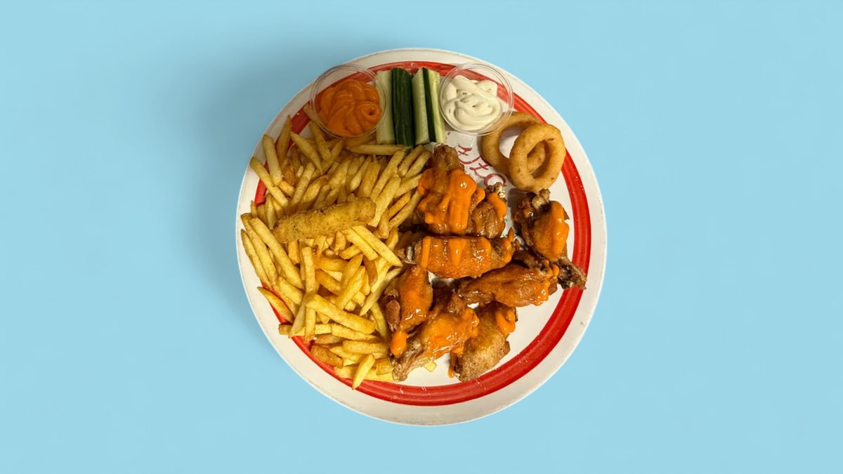 18 kpl kanansiipiä, ranskalaiset, 2kpl sipulirenkaita, mozzarellatikut, 2 kpl kastike
