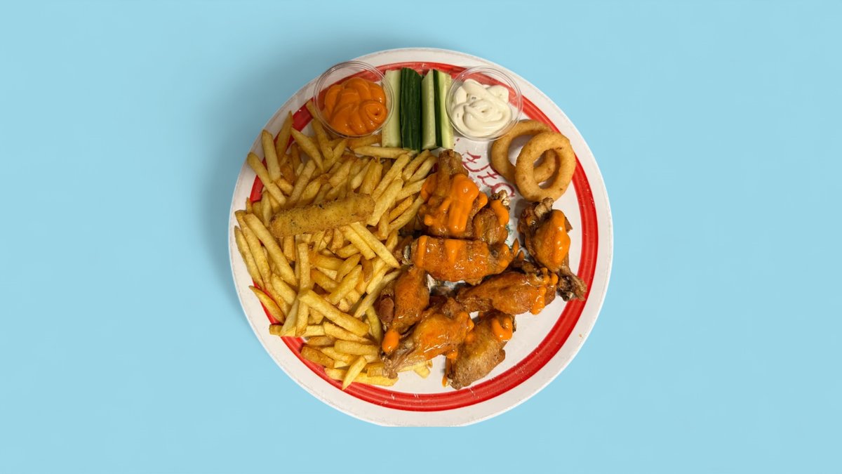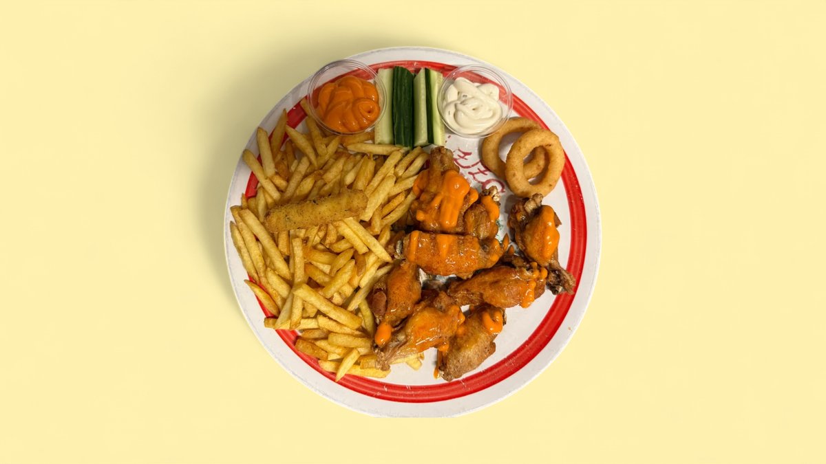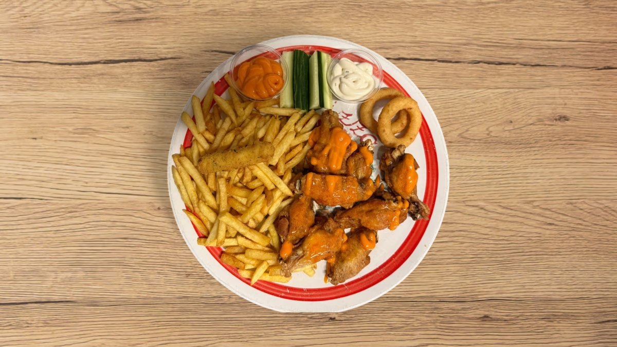 8 kpl kanansiipiä, ranskalaiset, 2kpl sipulirenkaita, mozzarellatikut, 2 kpl kastike