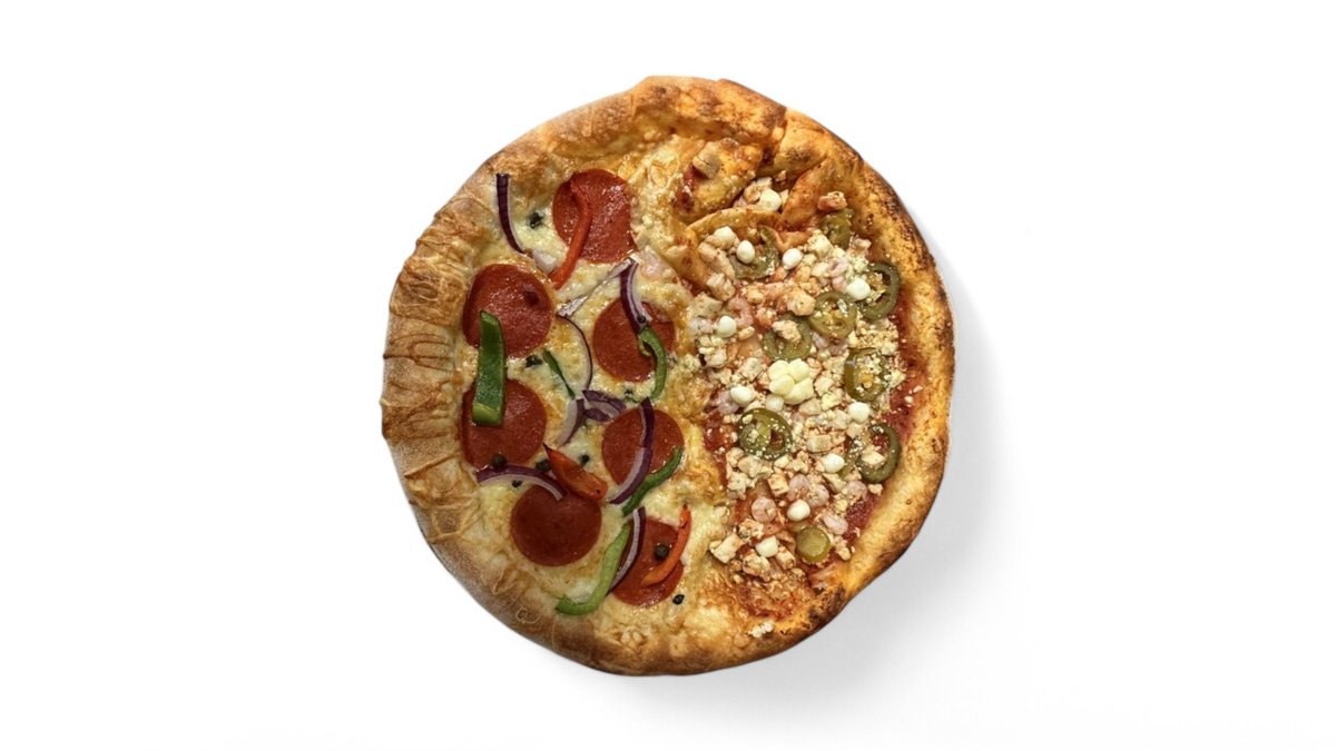 Half of the pizza is red pizza and half of it is white pizza. White part has Pepperoni, paprika, cheese, onion, Kapris. Red side has tomato sauce, shrimp, jalapeño, chicken and mozzarella cheese