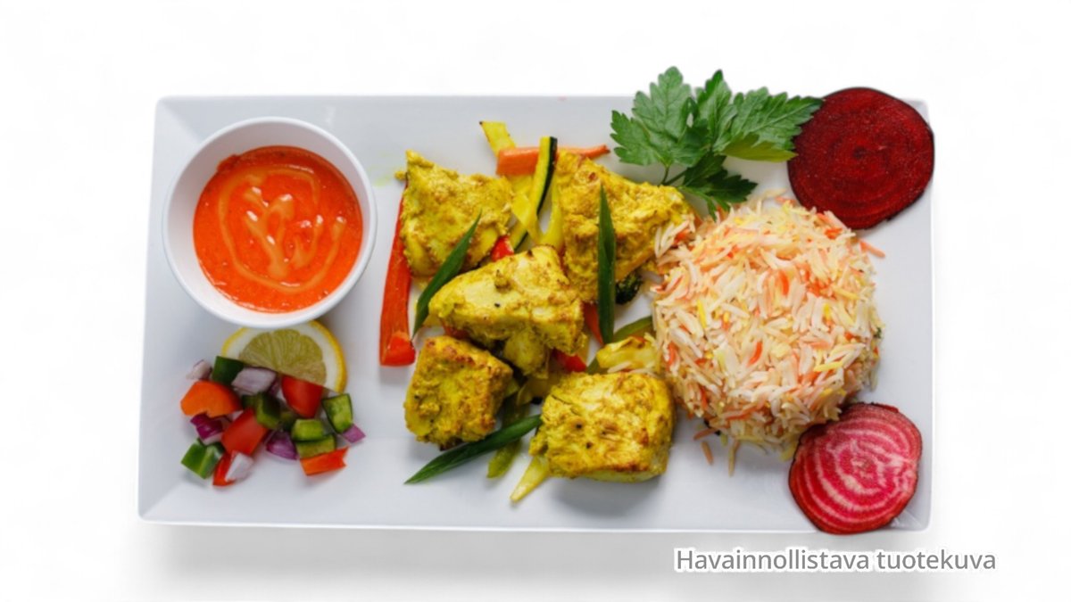Kanaa tulisessa kastikkeessa tomaatin, paprikan ja sipulin kera (G, P, L)