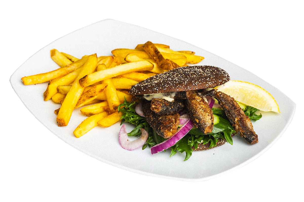 Ruissämpylän välissä paestettuja muikkuja, sallaattia, kurkkuva ja punastalyökkiä, kostukkeena on limetti-tillivuolukermoo lisäks ranskalaesia pottuja.