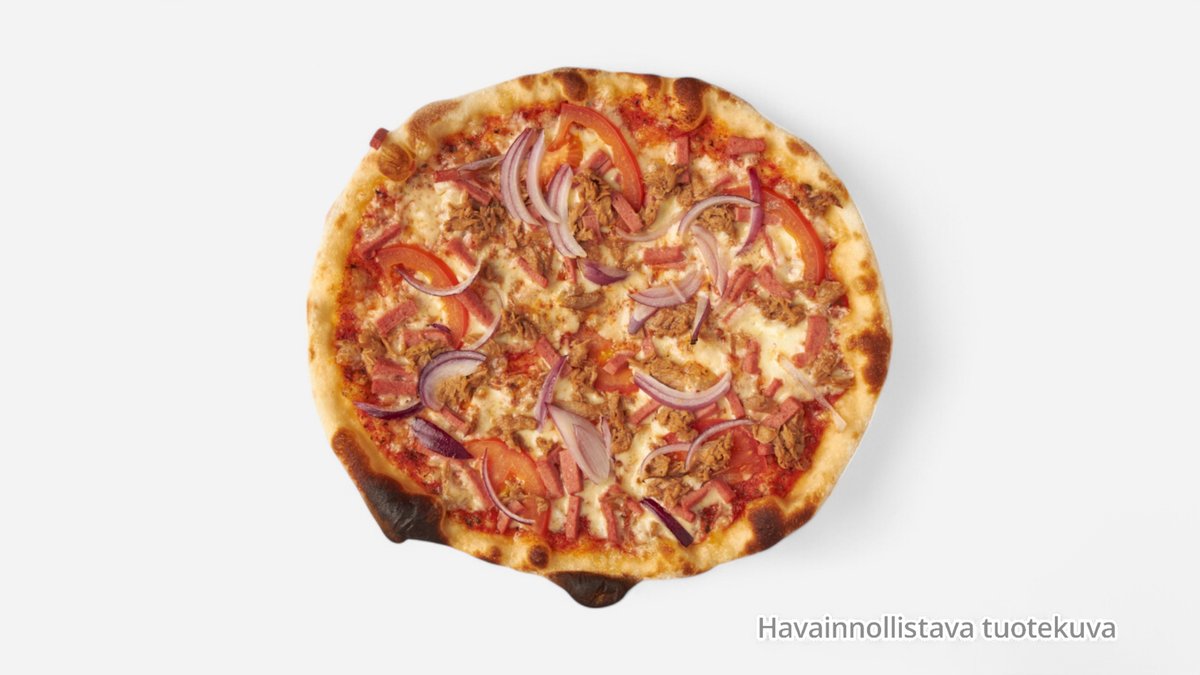 Pizzoihin sisältyy pizzakastike, juusto, oregano ja halutessasi valkosipuli. Lihojen alkuperämaa: Suomi