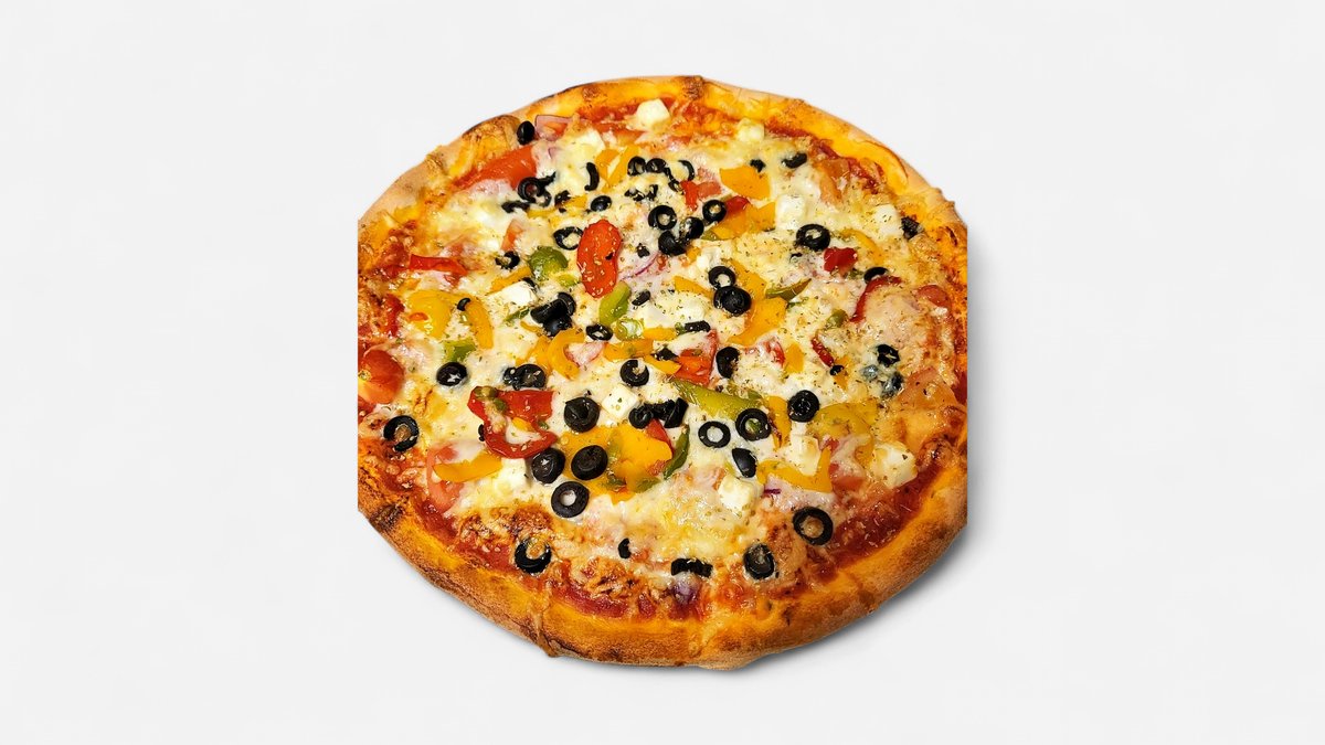 Salaattijuusto, sipuli, oliivi, tomaatti, paprika