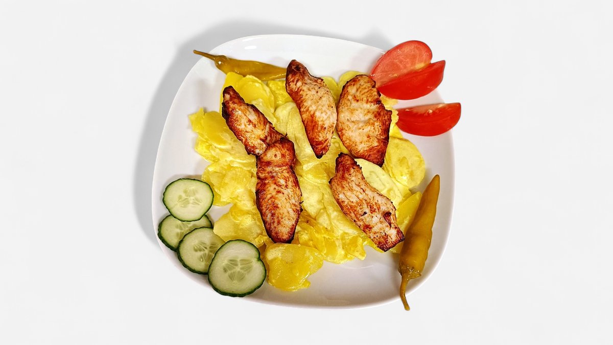 Valkosipuliperunat, kanafilee, salaatti, kastike