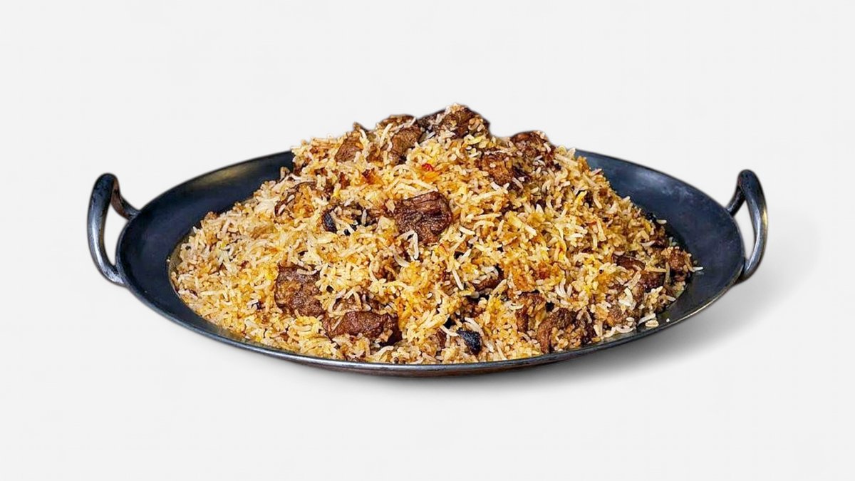 A fragrant, layered South Asian rice dish with marinated lamb, aromatic spices served with fried boiled, achar and eggplant cutlet