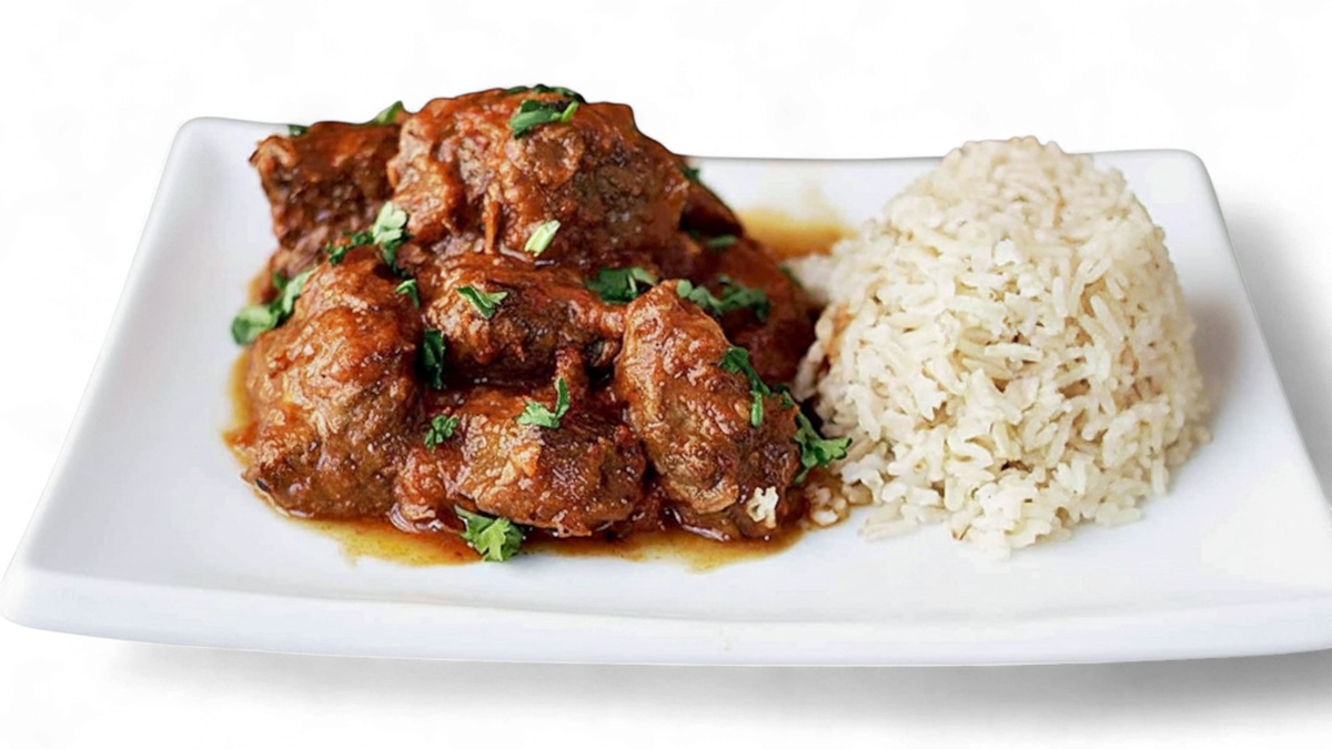 Goan-inspired Indian curry featuring tender, slow- cooked beef in a vibrant, deep red sauce