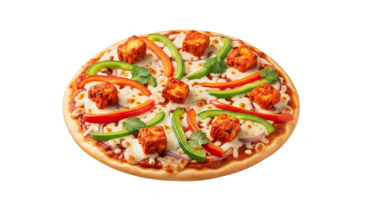 replaces traditional Italian pizza sauce with a rich, spiced tikka masala sauce and tops it with marinated Paneer tikka pieces