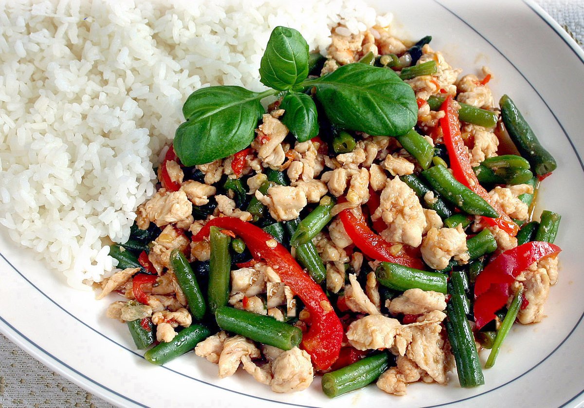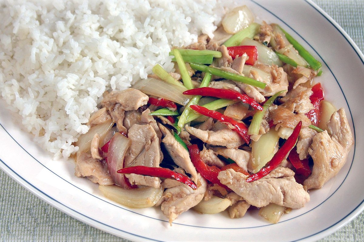 Nauti herkullisesta thaityylisestä broilerista, joka on paistettu ja tarjoillaan mausteisessa thaikastikkeessa, paprikan ja sipulin kera, sekä riisin knssa.