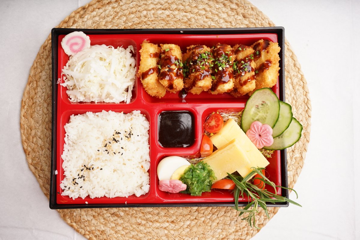 Perinteinen Japanilainen annos, tyypillisesti sisältäen riisiä tai nuudelia, kalaa, lihaa, tai kasviksia