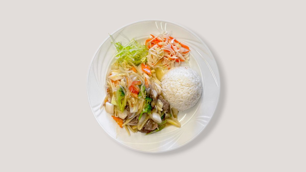 Naudanliha, sipuli, porkkana, paprika, valkosipuli, bambunversot, parsakaali, riisi