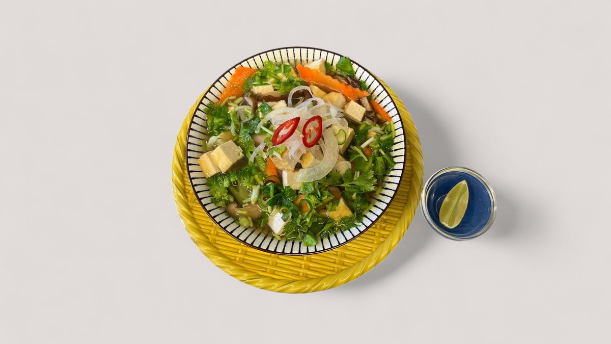 Tofu, sipuli, kevätsipuli, korianteri, porkkana, shiitake-sieni, parsakaali, naudan luuliemi