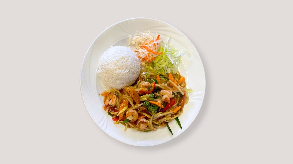 Riisinuudelit, sipuli, kiinankaali, paprika, purjo, parsakaali, porkkana, paahdetut sipulit...