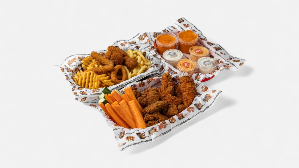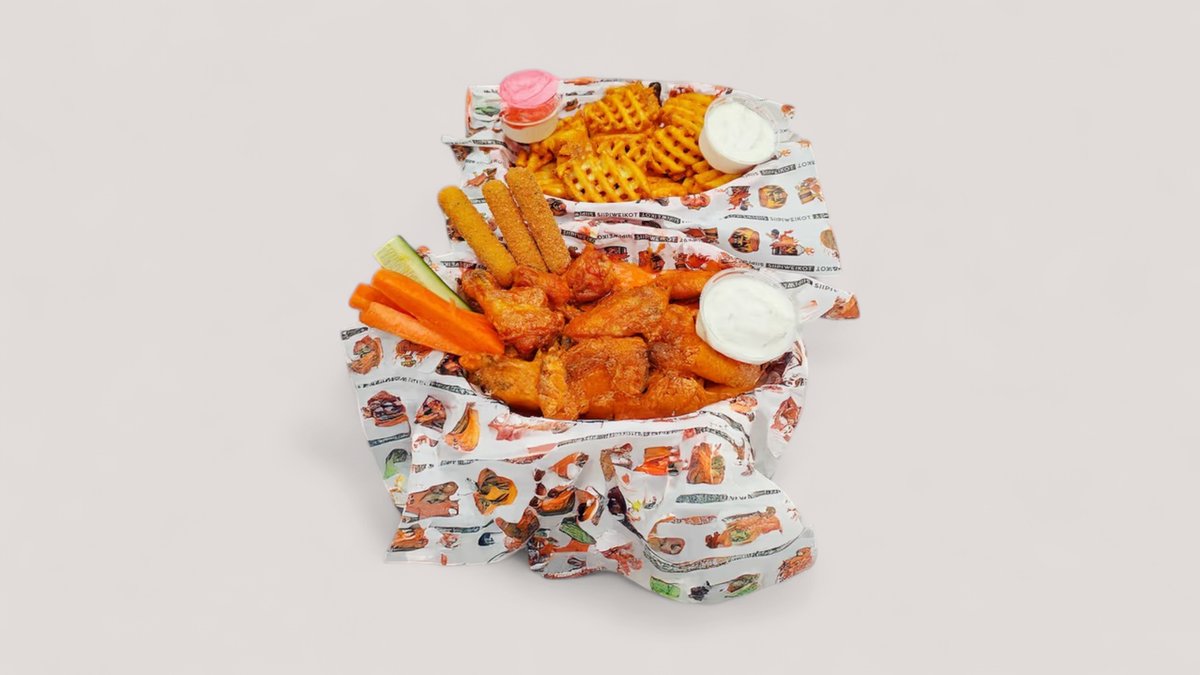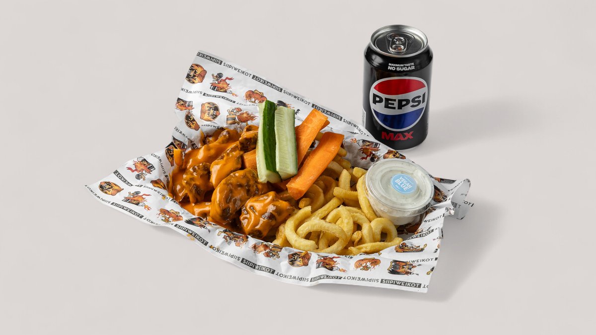 50 kpl siipeä, ristikkoperunat, kierreperunat, 10 kpl sipulirenkaita, 6 dippiä ja rehut.