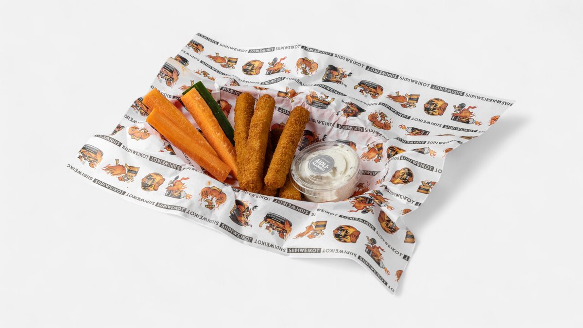 16 siiwegettä valitsemallasi kastikkeella, kierreranskalaisia, ristikkoperunoita, 3 kpl sipulirengasta, 3 kpl vegaanista chilinugettia, 4 dippiä. Kurkkua, porkkanaa ja halutessa selleriä.