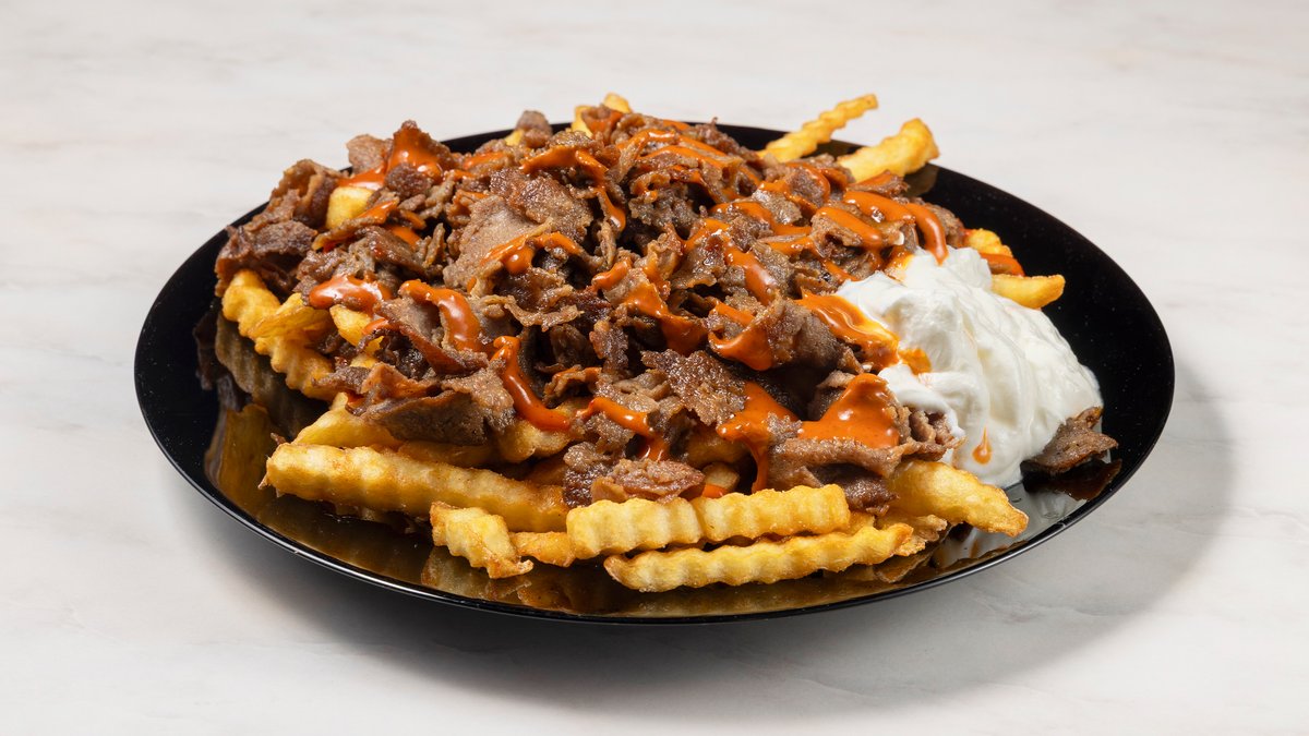 Ranskalaisia, kebabia, kebabkastiketta ja turkkilaista jogurttia. Valitse mieto tai tulinen kebabkastike, sekä haluatko annokseesi turkkilaista jogurttia.