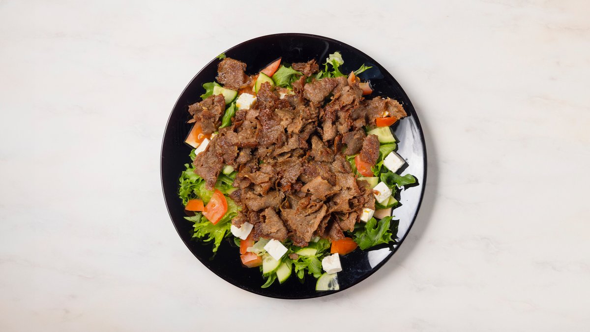 Jääsalaattia, kurkkua, tomaattia, salaattijuustoa, kebabia ja kebabkastiketta. Valitse mieto tai tulinen kebabkastike.