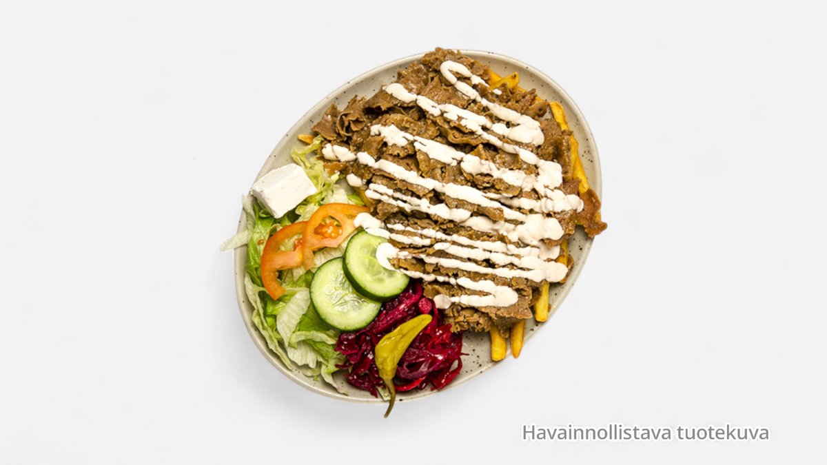 Kaikki annokset sisältävät raikasta salaattia, marinoitua punasipulia, sitruunaista kaalia ja tzatzikia. Annokissa käytetään vain kotimaista lihaa.