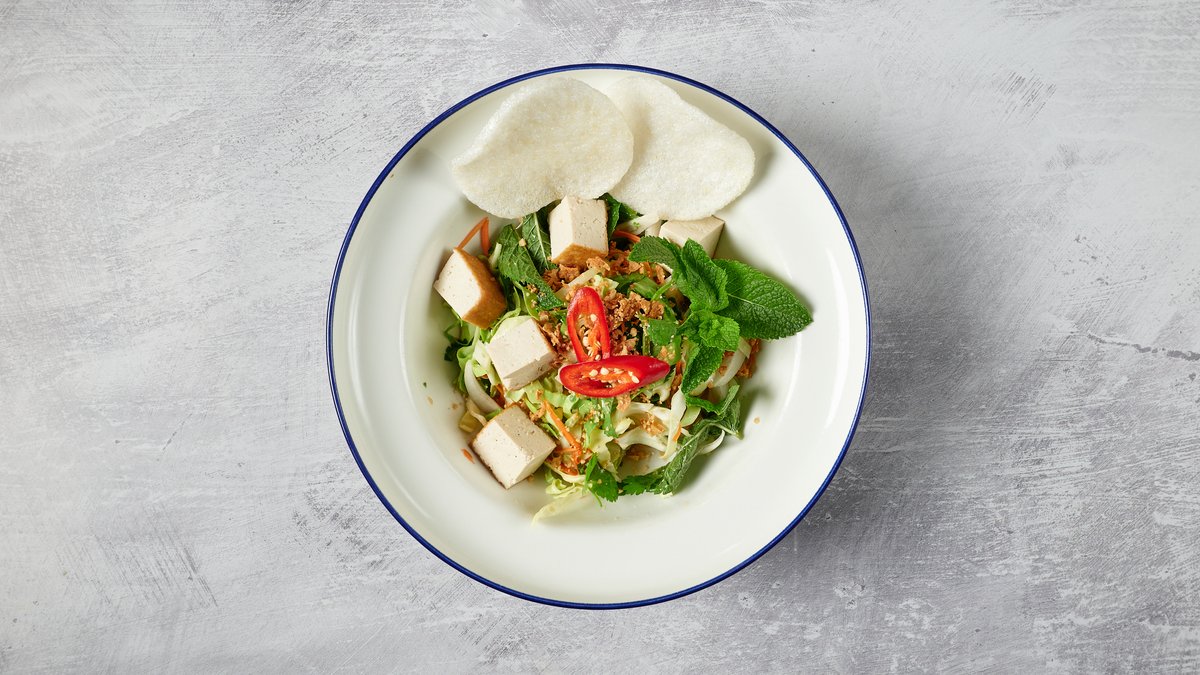 Nauta / kana / katkarapu / tofu, vehnänuudeli, pinaattikiinankaali, keräkaali, porkkana, sipuli, itu, kevätsipuli, korianteri, paahdettu sipulirouhe. (VP)
