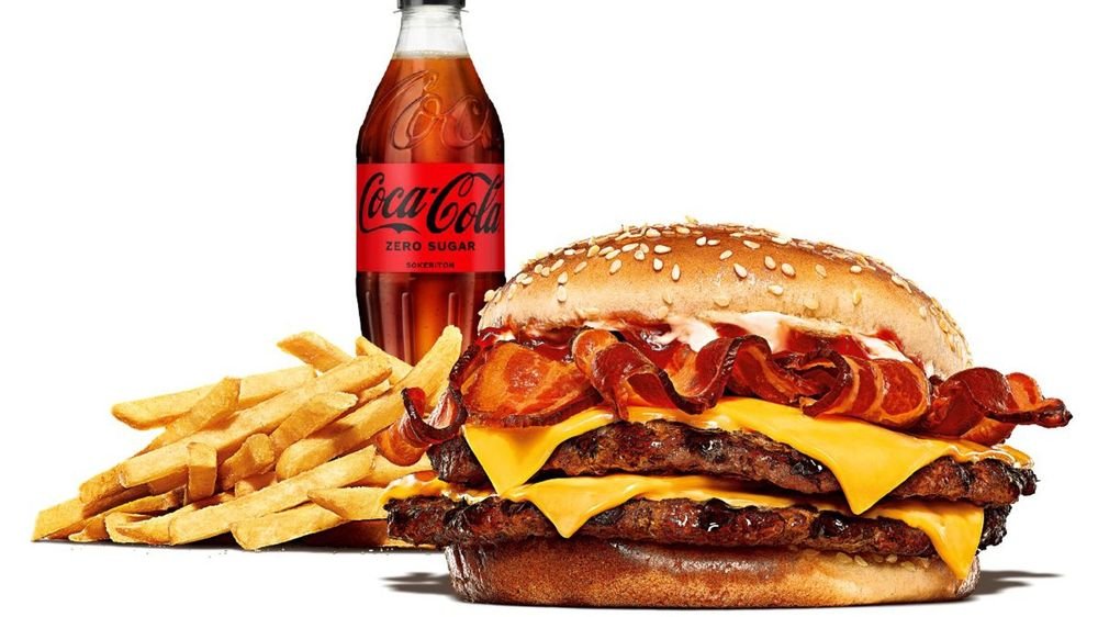 Kaksi liekillä grillattua ja suola pippuri -seoksella maustettua naudanlihapihviä, juustoa, kahdeksan siivua pekonia, vegaanimajoneesia, ketsuppia, seesaminsiemensämpylä.