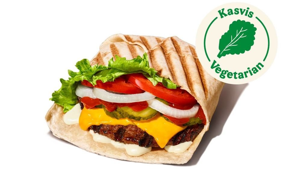 Vehnätortillan välissä liekillä grillattu kasvispihvi, juustoa, tuoretta tomaattia ja salaattia, suolakurkkua, sipulia, ketsuppia, vegaanimajoneesia.
