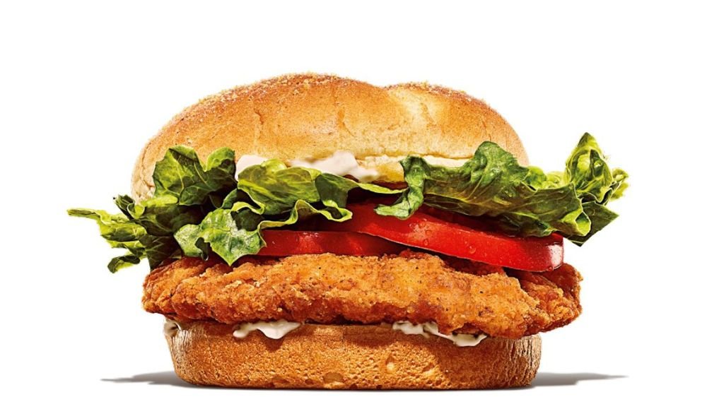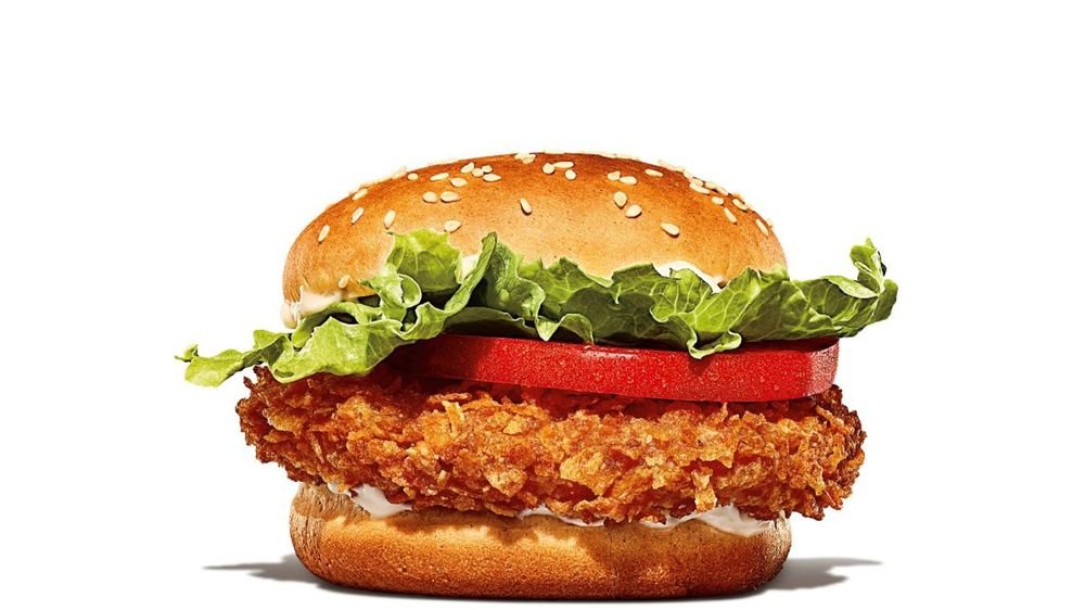 Leivitetty kanafilee, tuoretta tomaattia ja salaattia, vegaanimajoneesia, maissirouhepäällysteinen sämpylä.