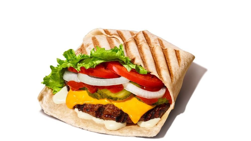 Vehnätortillan välissä liekillä grillattu ja suola pippuri -seoksella maustettu naudanlihapihvi, juustoa, tuoretta tomaattia ja salaattia, suolakurkkua, sipulia, ketsuppia, vegaanimajoneesia.