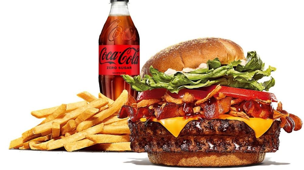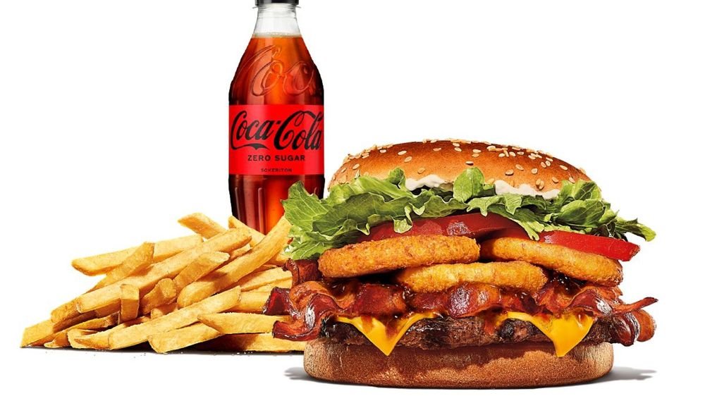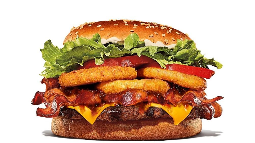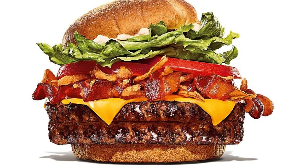 Kaksi liekillä grillattua ja suola pippuri -seoksella maustettua naudanlihapihviä, juustoa, pekonia, tuoretta tomaattia ja salaattia, paahdettua sipulia, vegaanimajoneesia, BBQ-kastiketta, maissirouhepäällysteinen sämpylä.