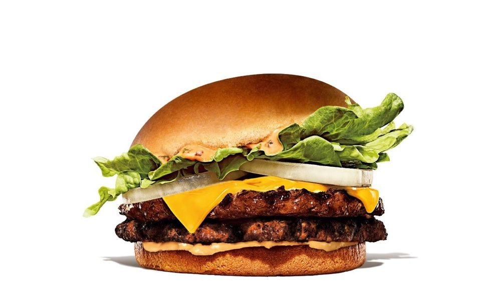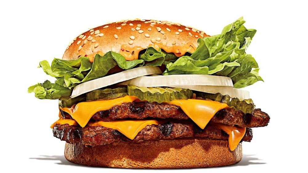 Kerroshampurilainen, jossa kaksi liekillä grillattua naudanlihapihviä, juustoa, tuoretta salaattia, suolakurkkua, sipulia, King™ -kastiketta, kerrossämpylä.