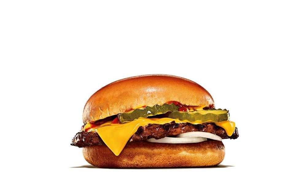 Liekillä grillattu naudanlihapihvi, juustoa, sipulia, suolakurkkua, ketsuppia, sinappia, perunasämpylä.