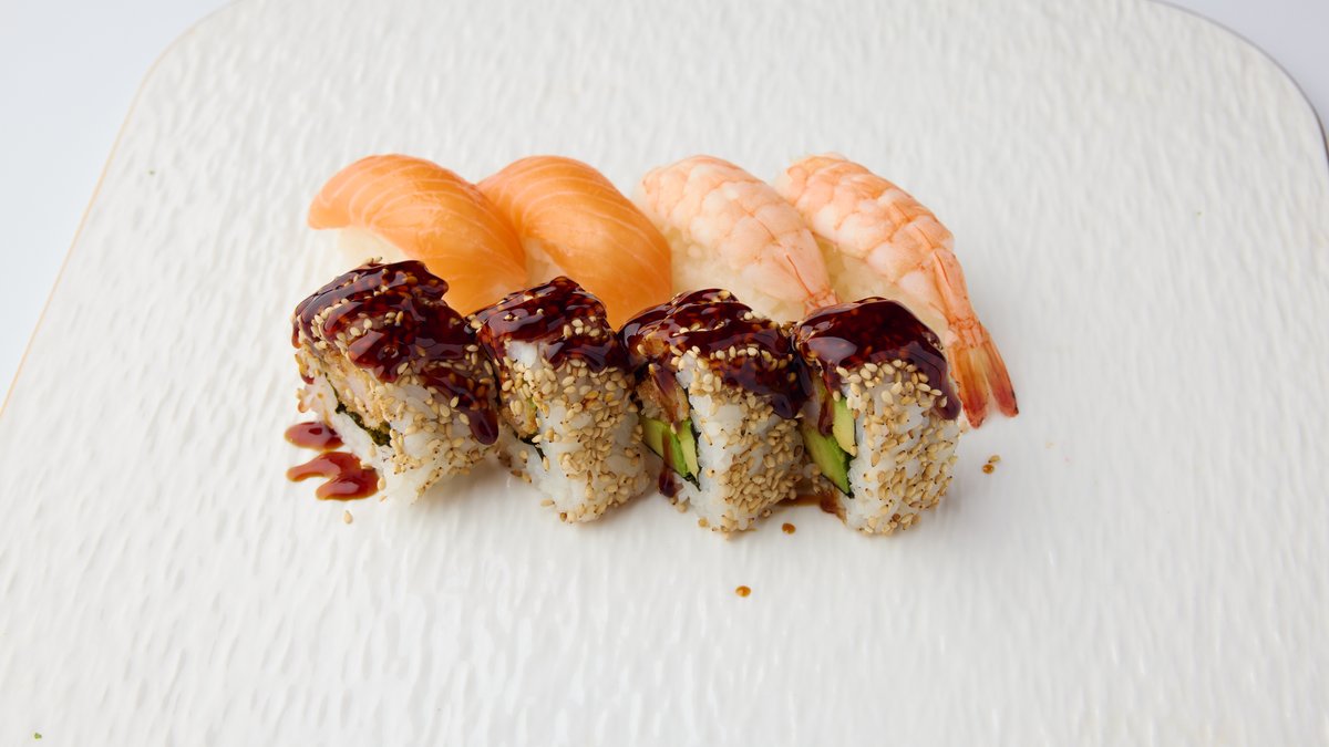 Uramaki: Tempura katkarapu x4, lohi x4, banaani x2 Nigiri: Lohi x3, grillattu lohi x3 Gunkan: Maissi x2, grillattu lohi x2