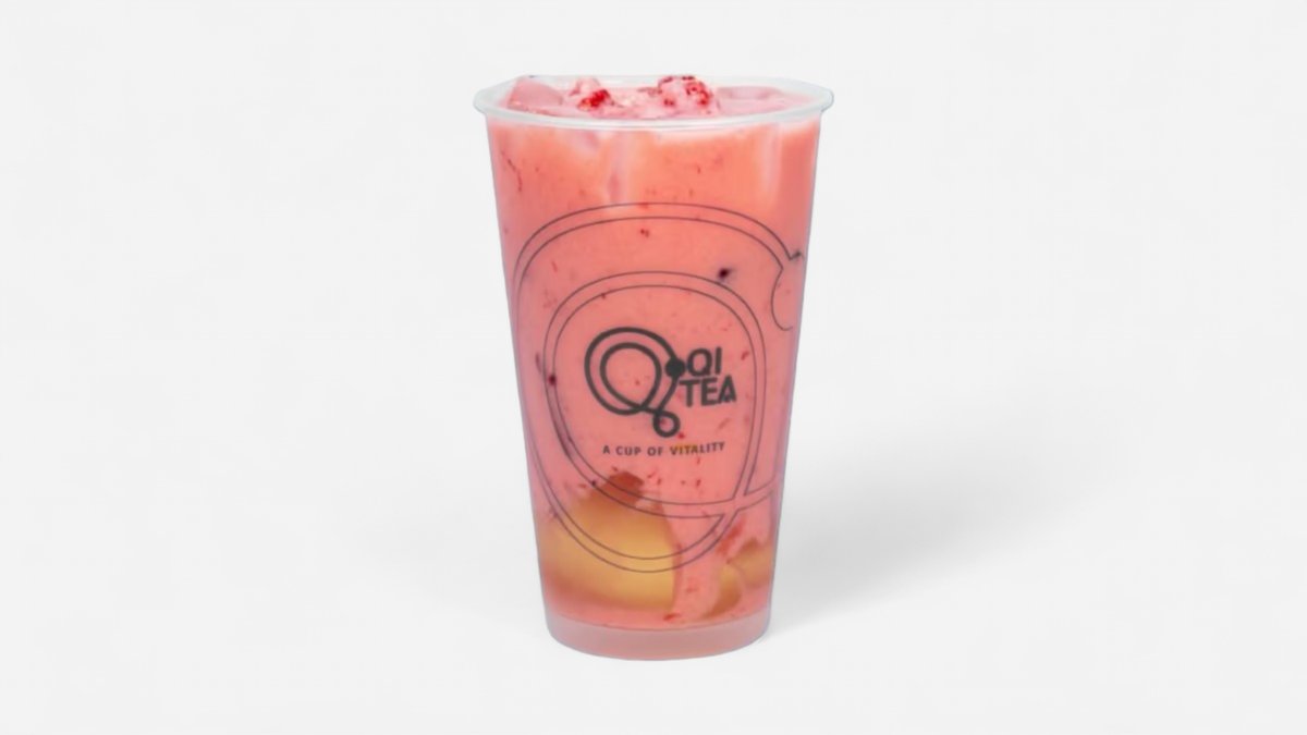 A jamine tea-based drink with fresh strawberry pieces and milk of choice./ Default topping: Aiyu jelly