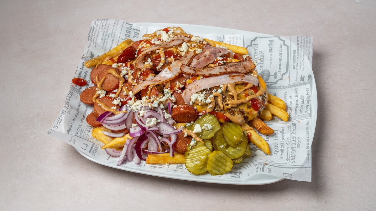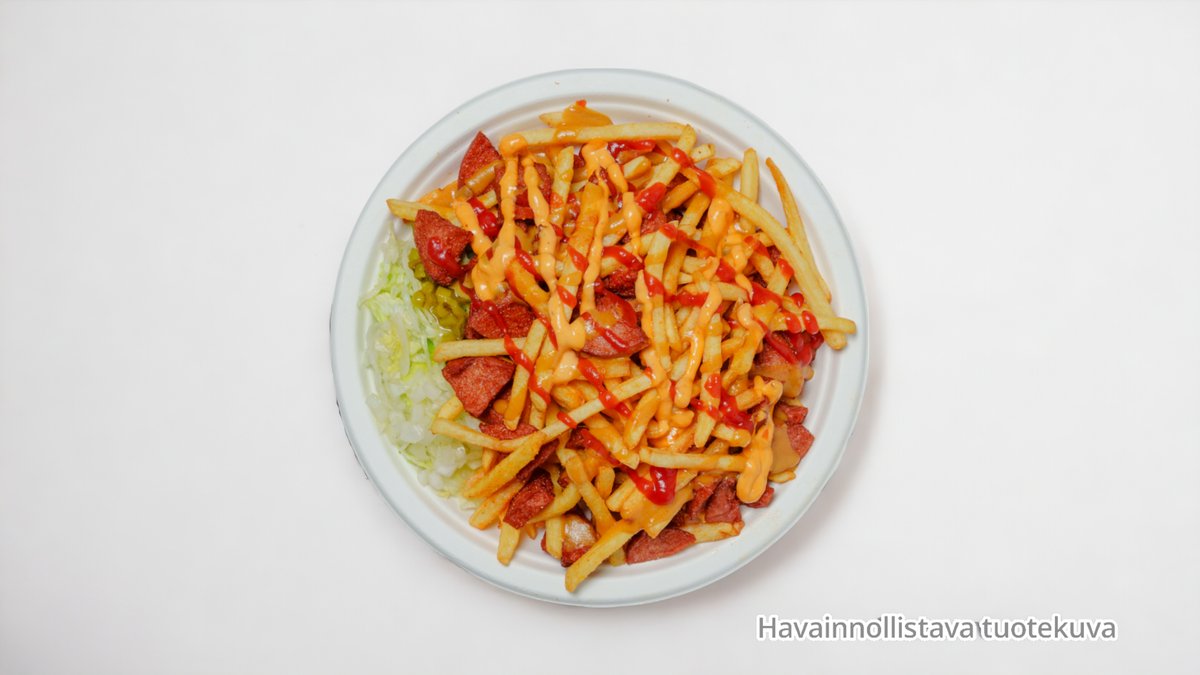 Makkaraperunat, 100g täyslihapihvi, 2x kanafilee, palvikinkku, cheddarjuusto, pekoni, valkosipulimajoneesi