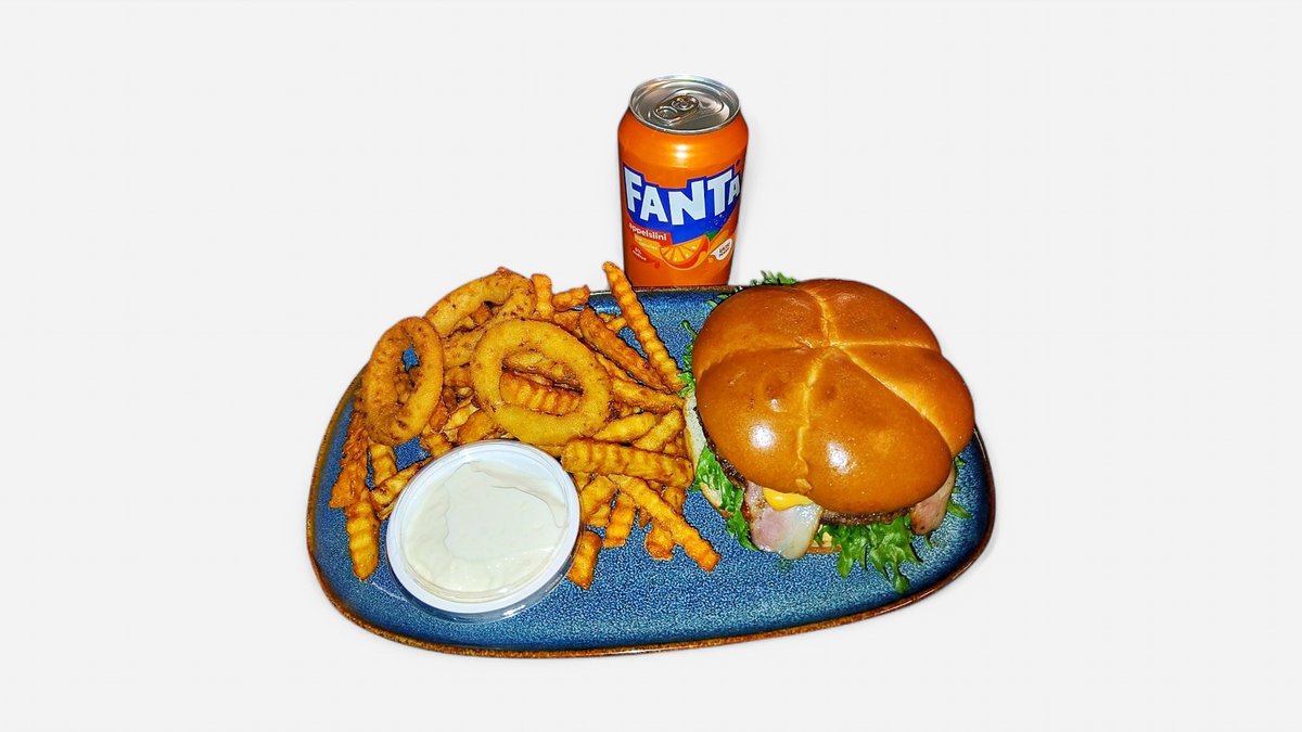 2x 100g täyslihapihvi, ranskalaiset, cheddarjuusto, grillattu ananasrengas, aurajuusto, BBQ-kastike, 0,33l juoma + valitsemasi dippi