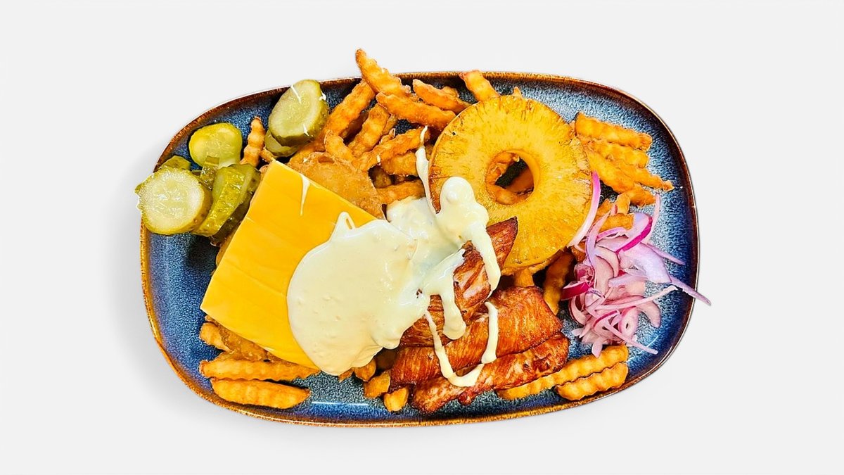 Ranskalaiset, 3x paistettu kanafilee, 100g kananpihvi, cheddarjuusto, grillattu ananasrengas, aurajuusto, currymajoneesi