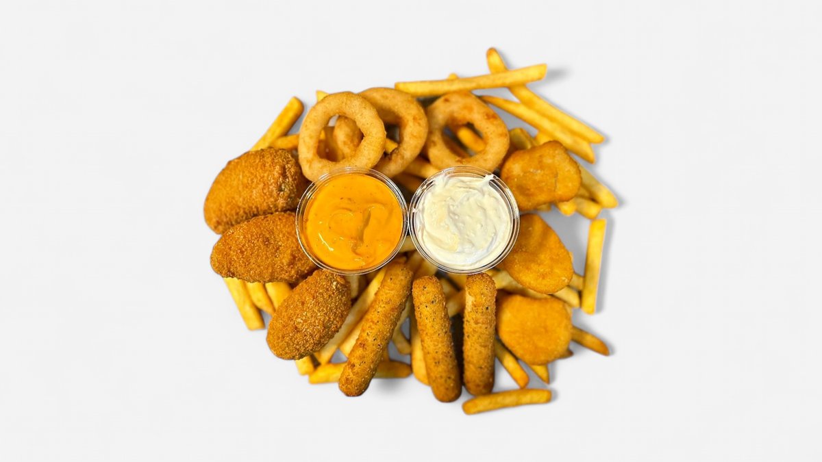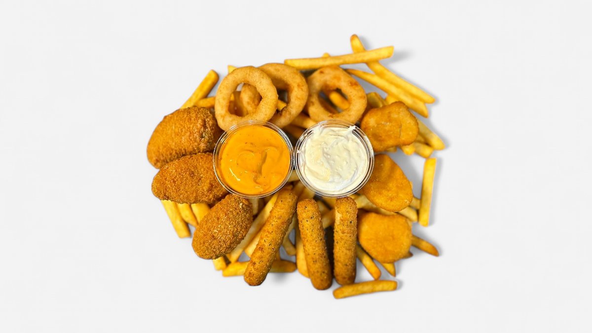 Isot ranskalaiset, 3x kananugetti, 3x mozzarellatikku, 3x jalopenopopper, 3x sipulirengas, grillattu ananasrengas, 2x valitsemasi dippi