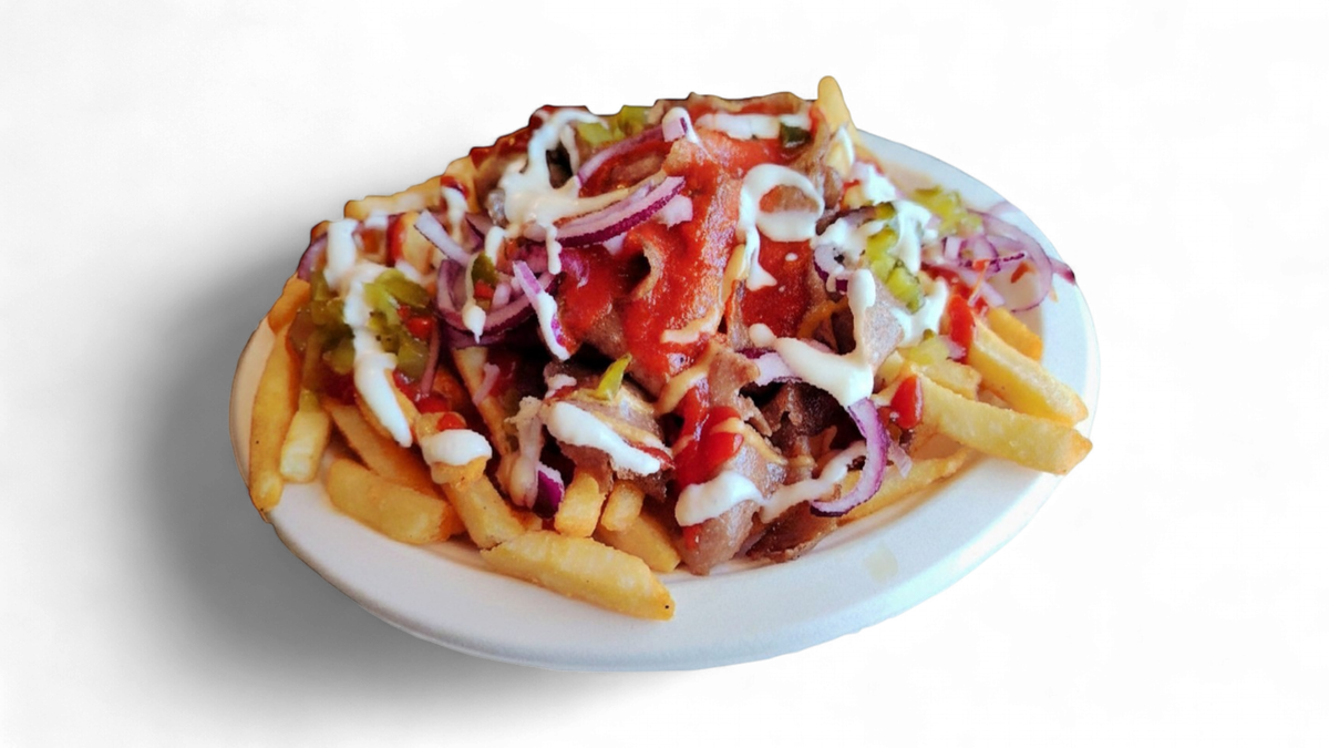 Makkaraperunat, Juusto, aurajuusto, fetajuusto, Ketsuppi, sinappi, valkosipulimajoneesi, suolakurkkuja, tuoretta punasipulia😋