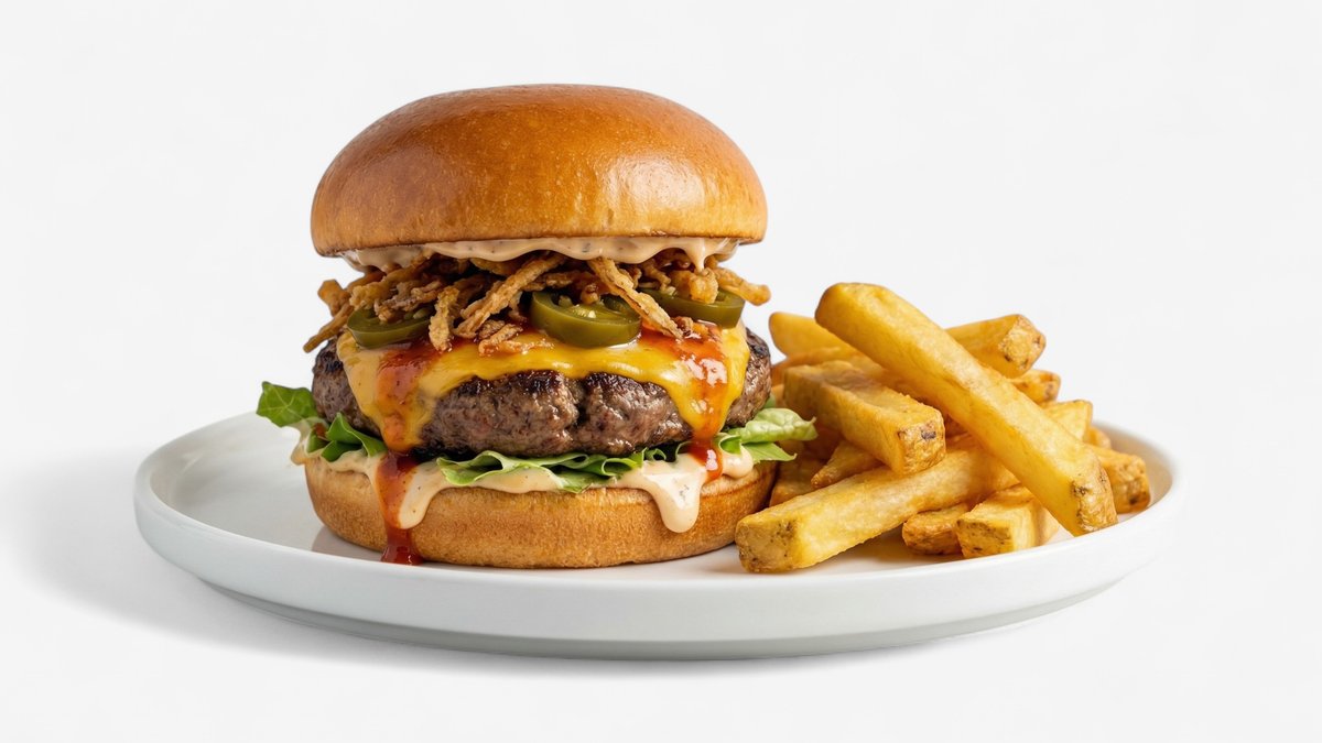 Briossia, naudanlihapihvi 180g, cheddarjuustoa, gochujang majoneesi, Valkosipulikastike, paahdettu sipuli, jalapeno , salaattia , Lisukkeena maalaisranskalaisia,